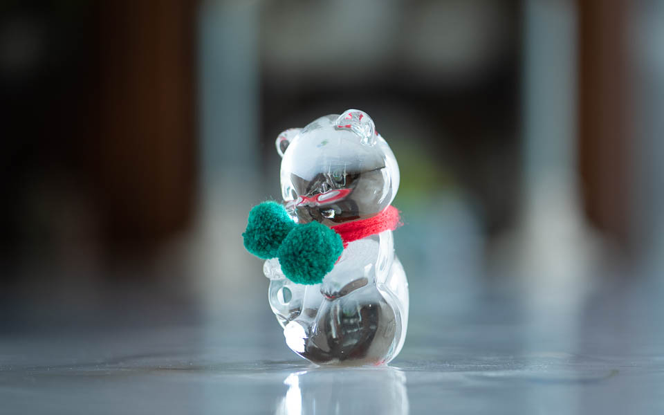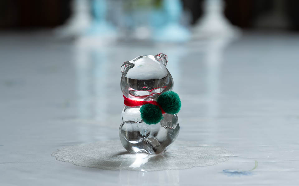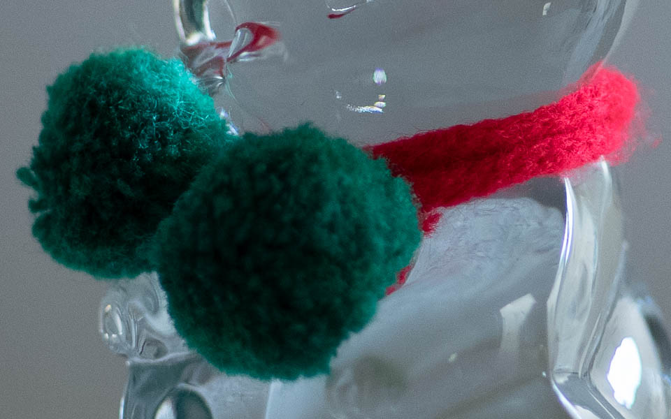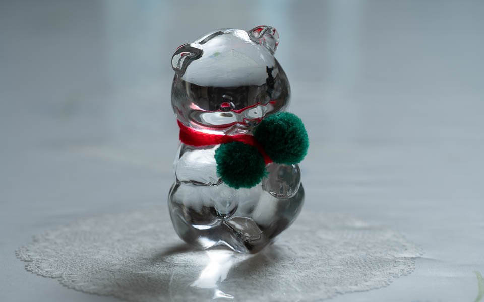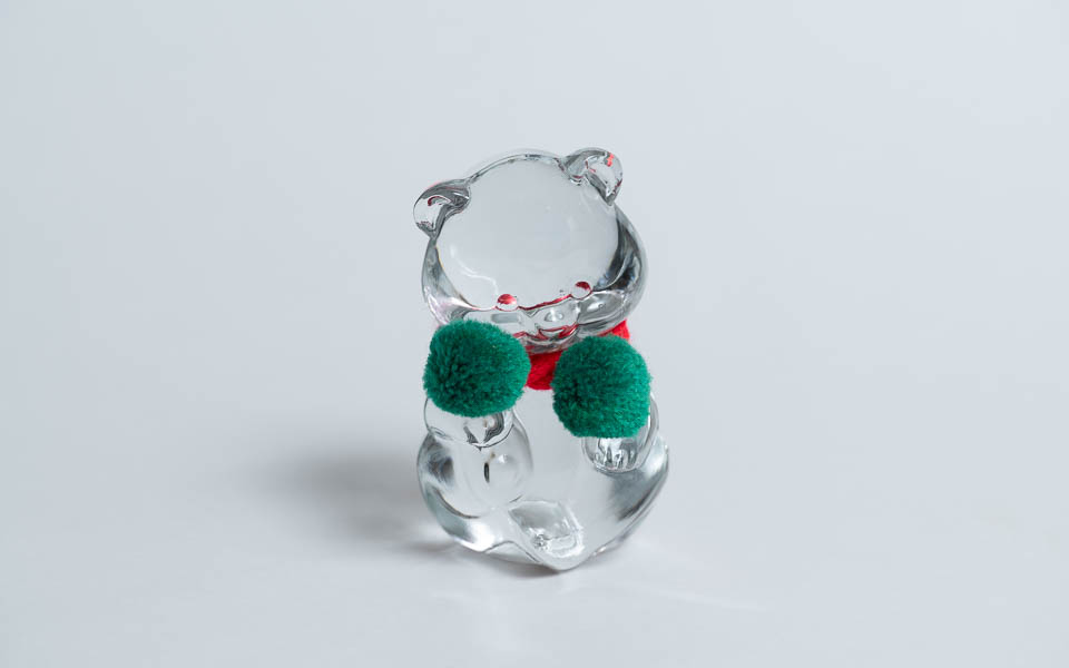 クリスマスカラーのボンボンがついた赤いマフラーを巻いています。このベビーベアはクリスタル製のクリスマスフィギュリンです。