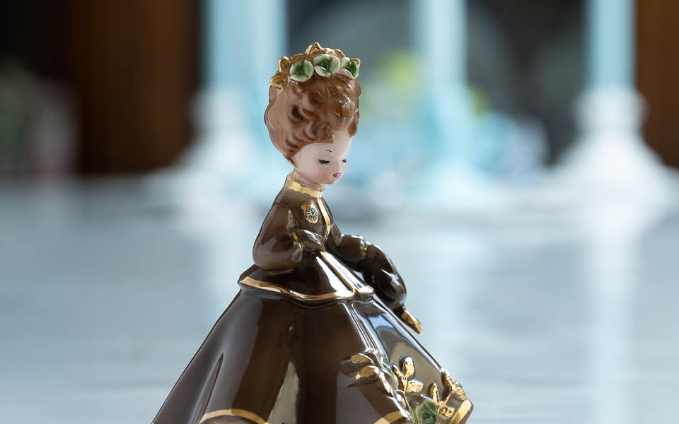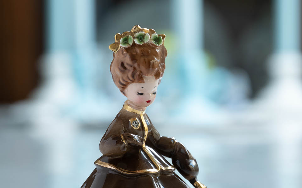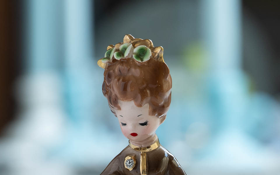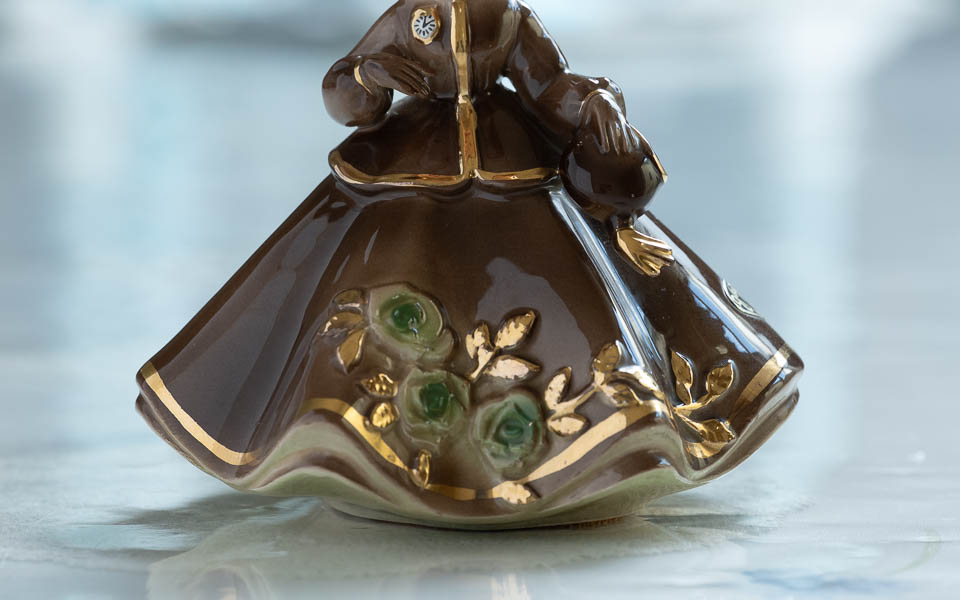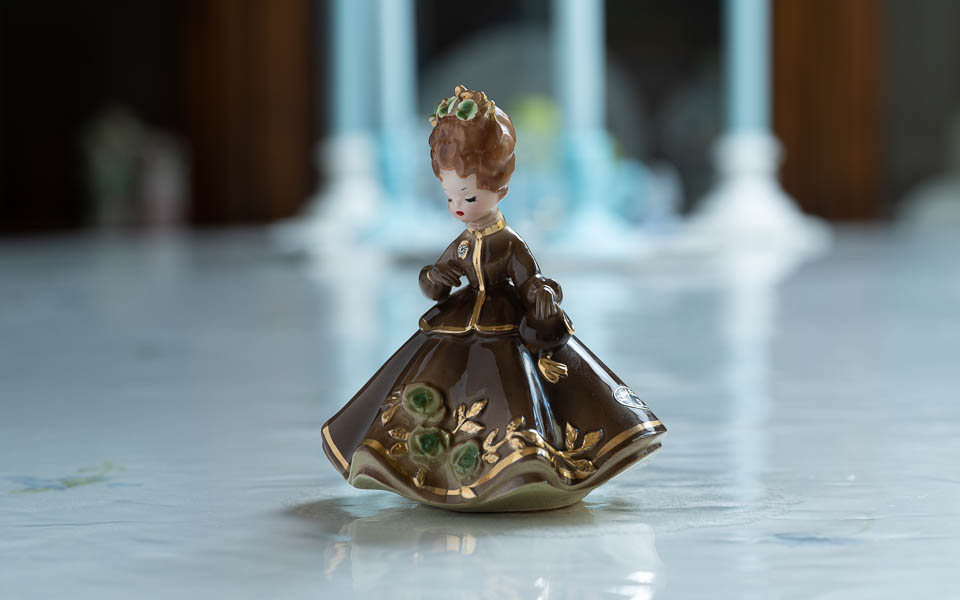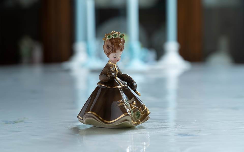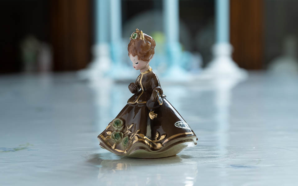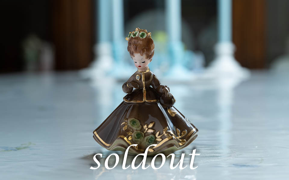 右胸に時計のブローチをつけて、ニュールックシルエットのドレスを着ています。ドレスのすそと髪の毛を飾る深みのあるグリーンのバラと茶色のドレスの色の組み合わせが、パステルカラーの優しい色のドレスをまとっていることの多いジョセフオリジナルの女性の中でも際立っています。それにもましてこのフィギュリンの目を引くのは、伏し目がちな彼女のお顔の美しさです。その凛としたたたずまいは古いハリウッド映画の中から抜け出してきたようです。このエレガントな彼女を是非お手元に置いて愛でていただきたいと思います。