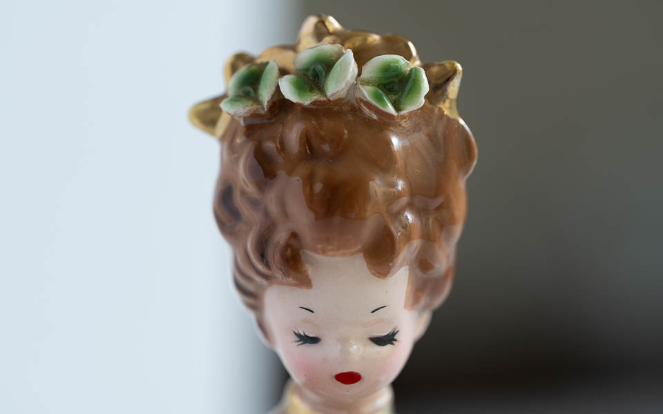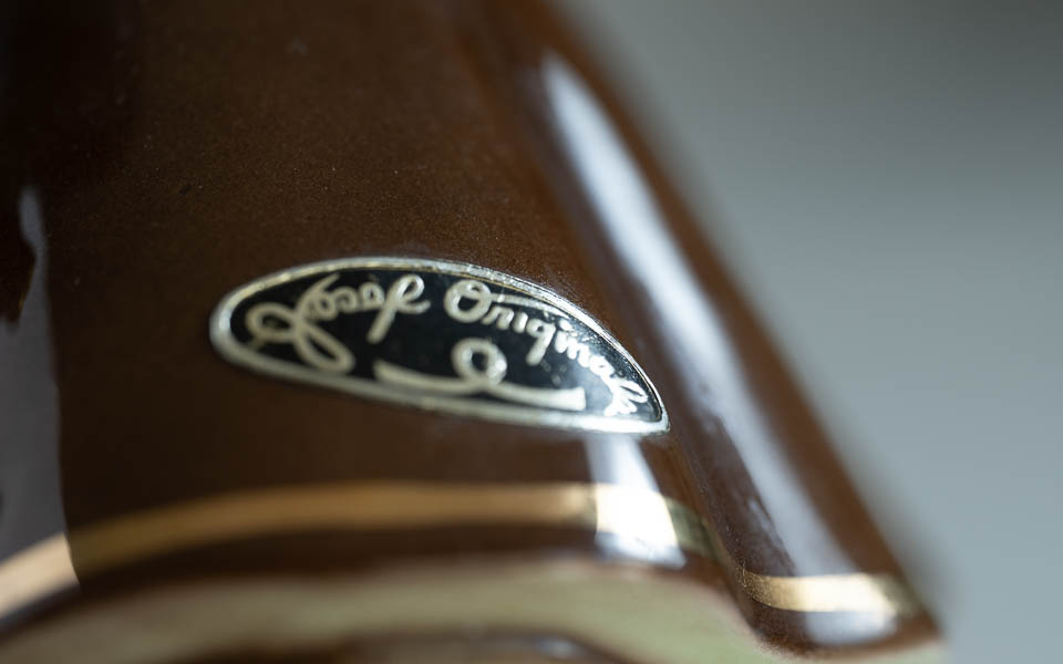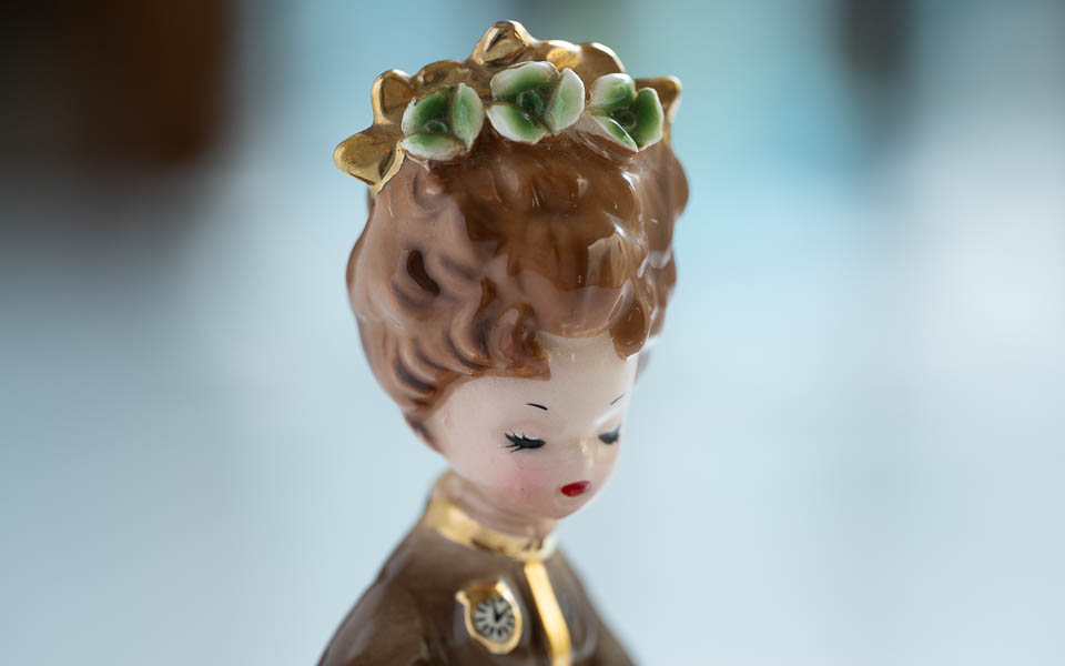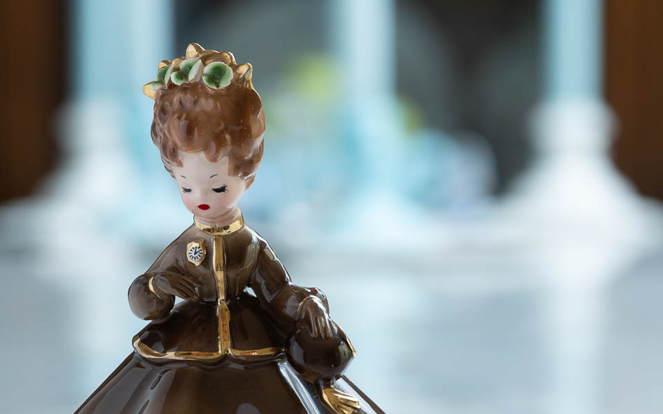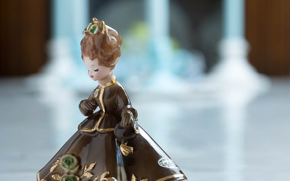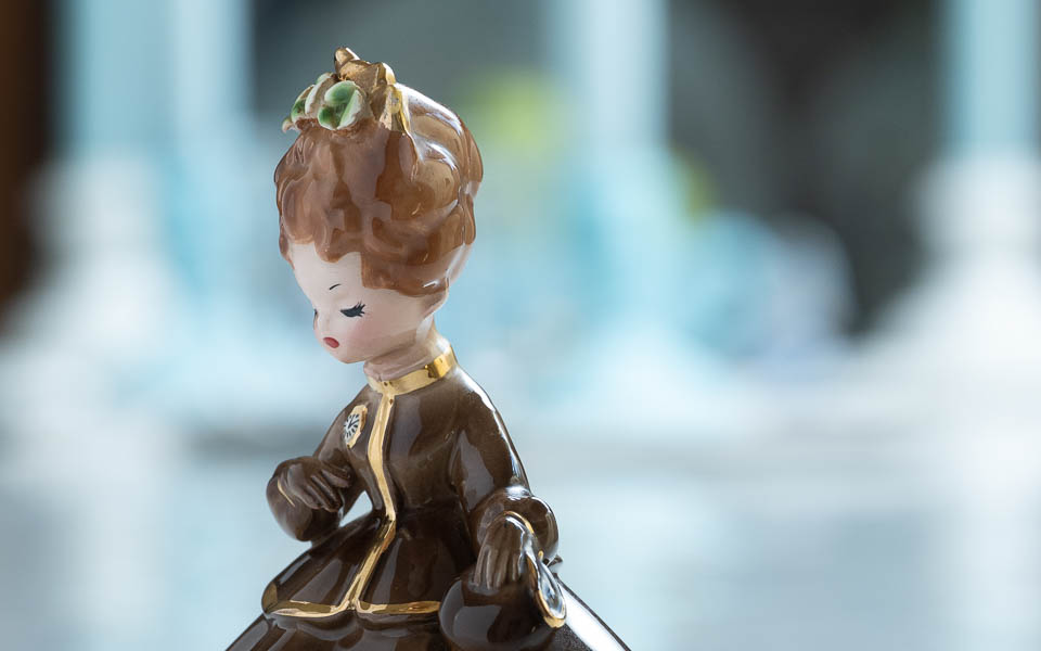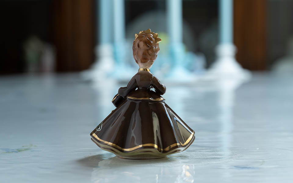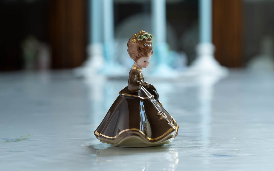 右胸に時計のブローチをつけて、ニュールックシルエットのドレスを着ています。ドレスのすそと髪の毛を飾る深みのあるグリーンのバラと茶色のドレスの色の組み合わせが、パステルカラーの優しい色のドレスをまとっていることの多いジョセフオリジナルの女性の中でも際立っています。それにもましてこのフィギュリンの目を引くのは、伏し目がちな彼女のお顔の美しさです。その凛としたたたずまいは古いハリウッド映画の中から抜け出してきたようです。このエレガントな彼女を是非お手元に置いて愛でていただきたいと思います。